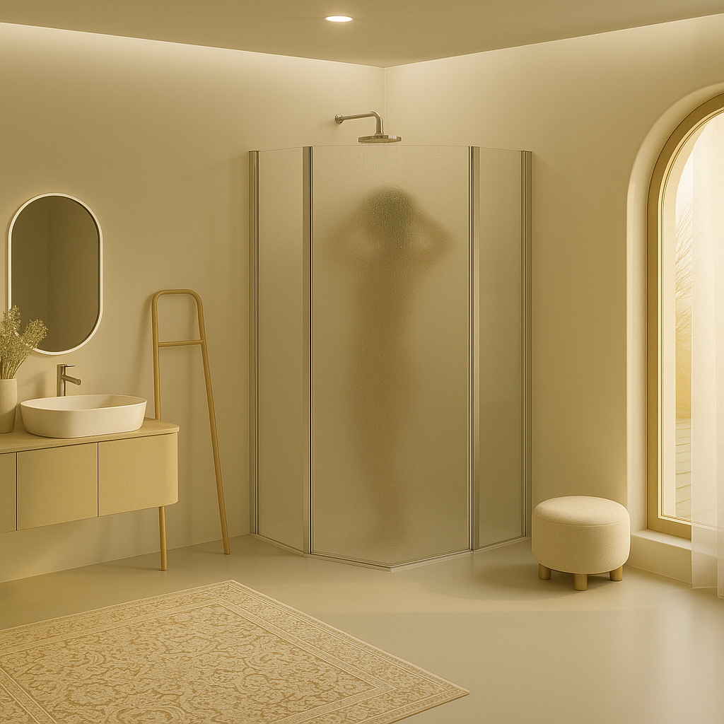 Eckeinstieg Duschkabine Modell Matilde, 90x90x 180 cm. Die Befestigung der Glastüren an der Wand über ein Alu-U-Profil, in das das Profil mit dem Drehscharnier mit Glas-Falttür eingeschoben und mit 3 winzigen Blechschrauben gesichert wird, kommt mir etwas lausig vor. Ich hoffe, der Hersteller hat si...